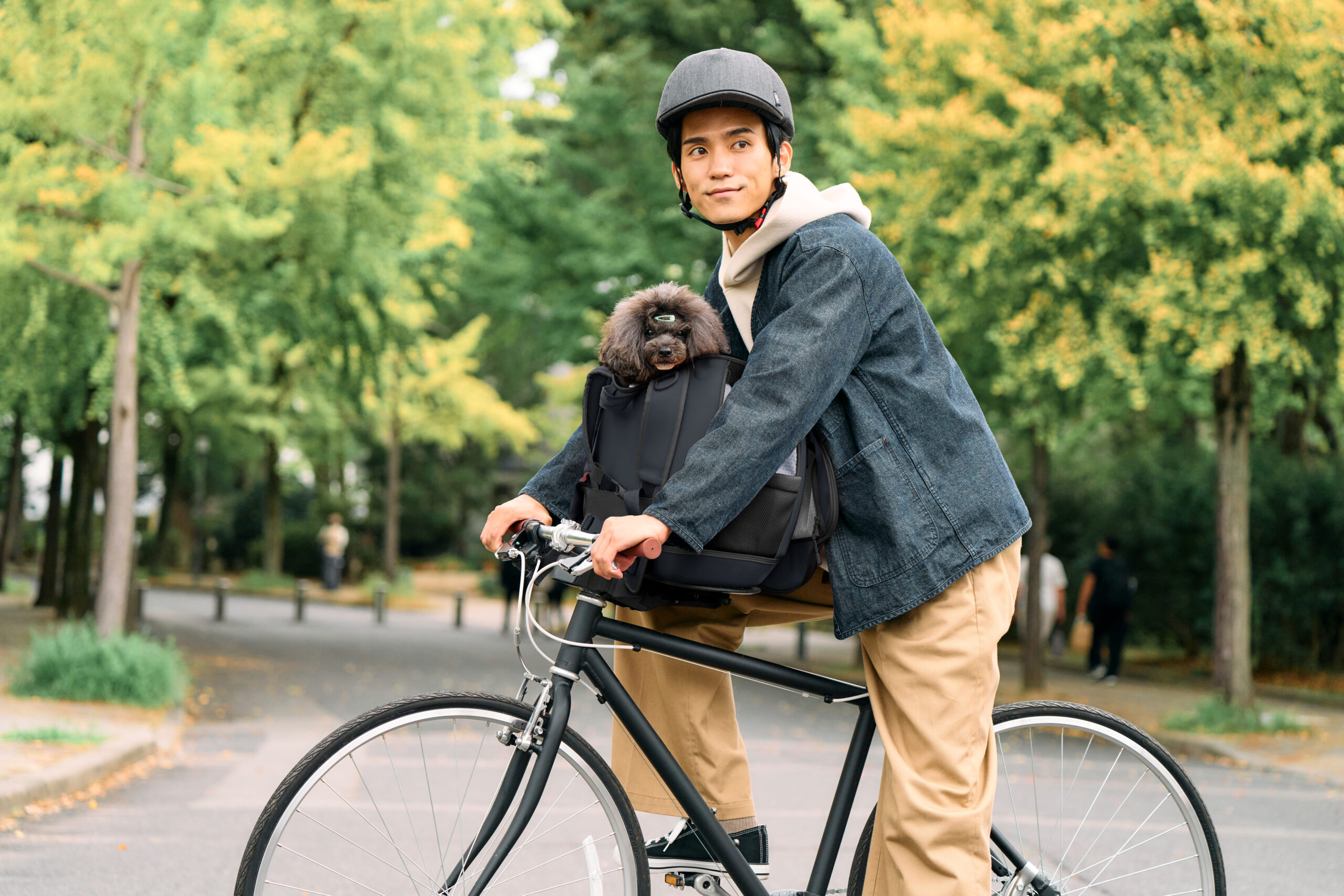「ハグバディー」は、従来のバスケットとは違い、ハンドルの内側に固定します。近い距離でいつでも様子が確認できるため、飼い主・ペットともに安心感を持って移動できます。外の景色を一緒に楽しめるよう、安全性を確保しつつ、走行中もペットが顔を出せる蓋のデザインにこだわりました。固定には、当社の自転車用バスケットなどで採用している独自の着脱機構を応用。強固な固定力を持ちながら、ワンタッチで簡単に取り外せるため、自転車での移動から到着後の徒歩移動まで、このリュックひとつでスムーズに切り替えられる新しいスタイルを実現しました。一人で自転車に乗るときは、アタッチメントベースを折りたためるため邪魔になりません。■buddiQ(バディック)「HUG Buddy(ハグバディー)」(PET-012)