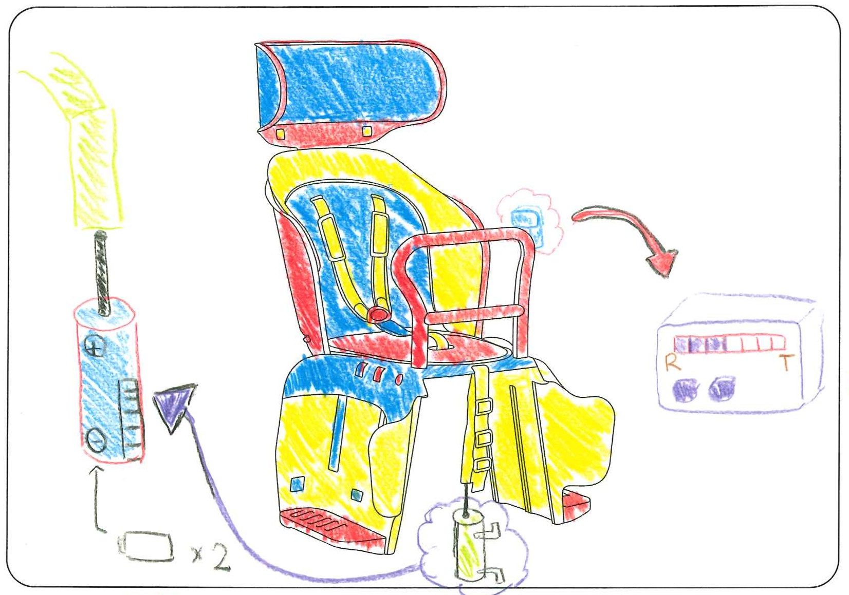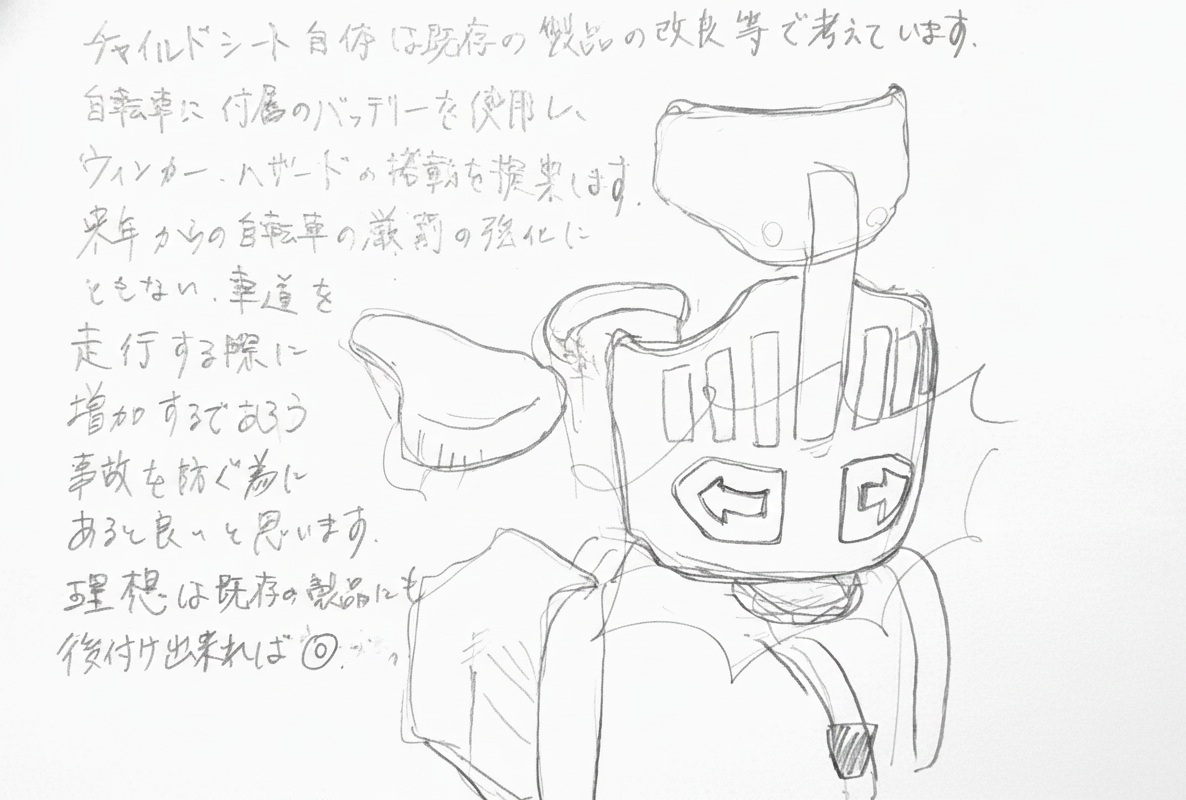自転車に搭載されているバッテリーを使用し、ウインカーとハザードの搭載の提案です。来年からの厳罰の強化に伴い車道を走行する自転車が増加されると思われます。車道から交差点を左折する際に歩行者との接触などの事故が増える事が予想されます。ウインカーがあることで確認しにくい後方などに周知することで事故そのものを減らすのが目的です。既存の製品に後付け出来れば買い替えしないお客の獲得に繋がると思われますが、その場合は別のバッテリーで電源の確保を考えています。が、まずは新製品からの導入でチャイルドシート自体を買い替えていただき、その際に出る使用していたチャイルドシートを下取りした後メンテナンスを行い、直営店などで割安で販売すれば、高くて手が出せない客層への獲得も可能かと思われます。